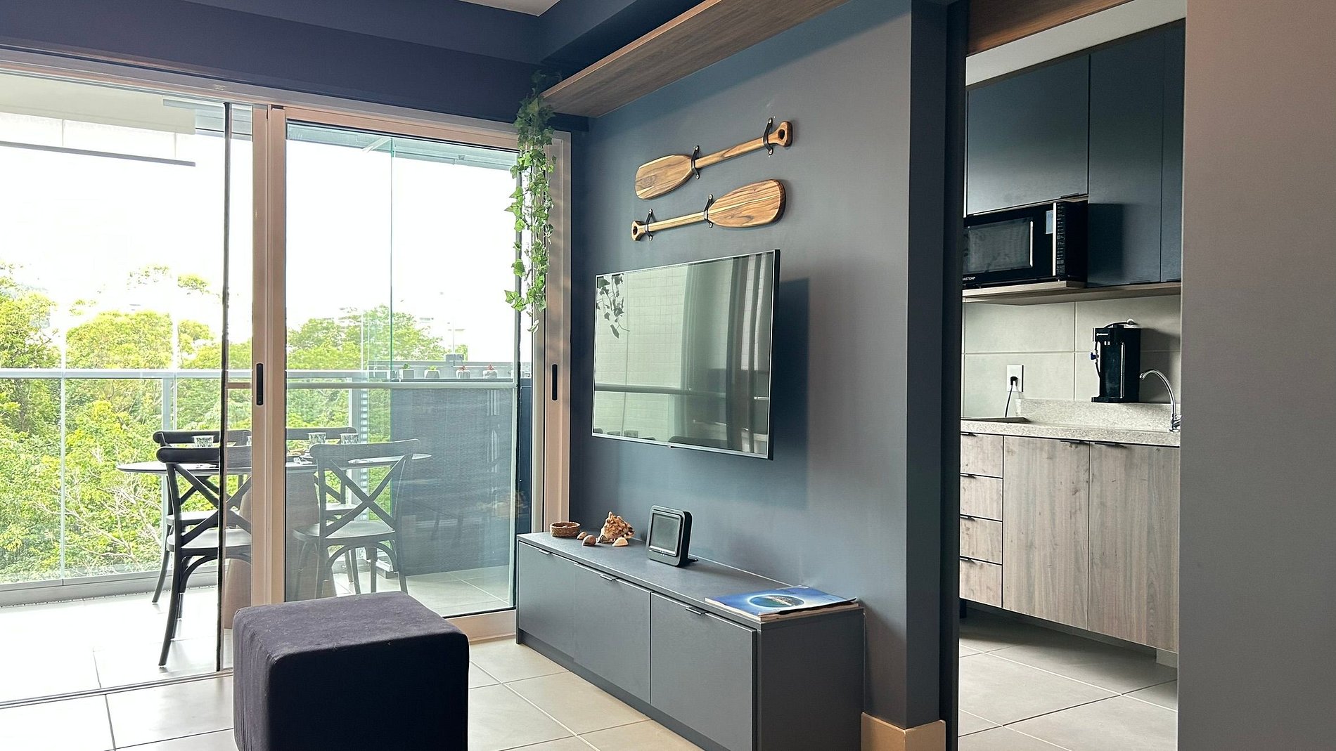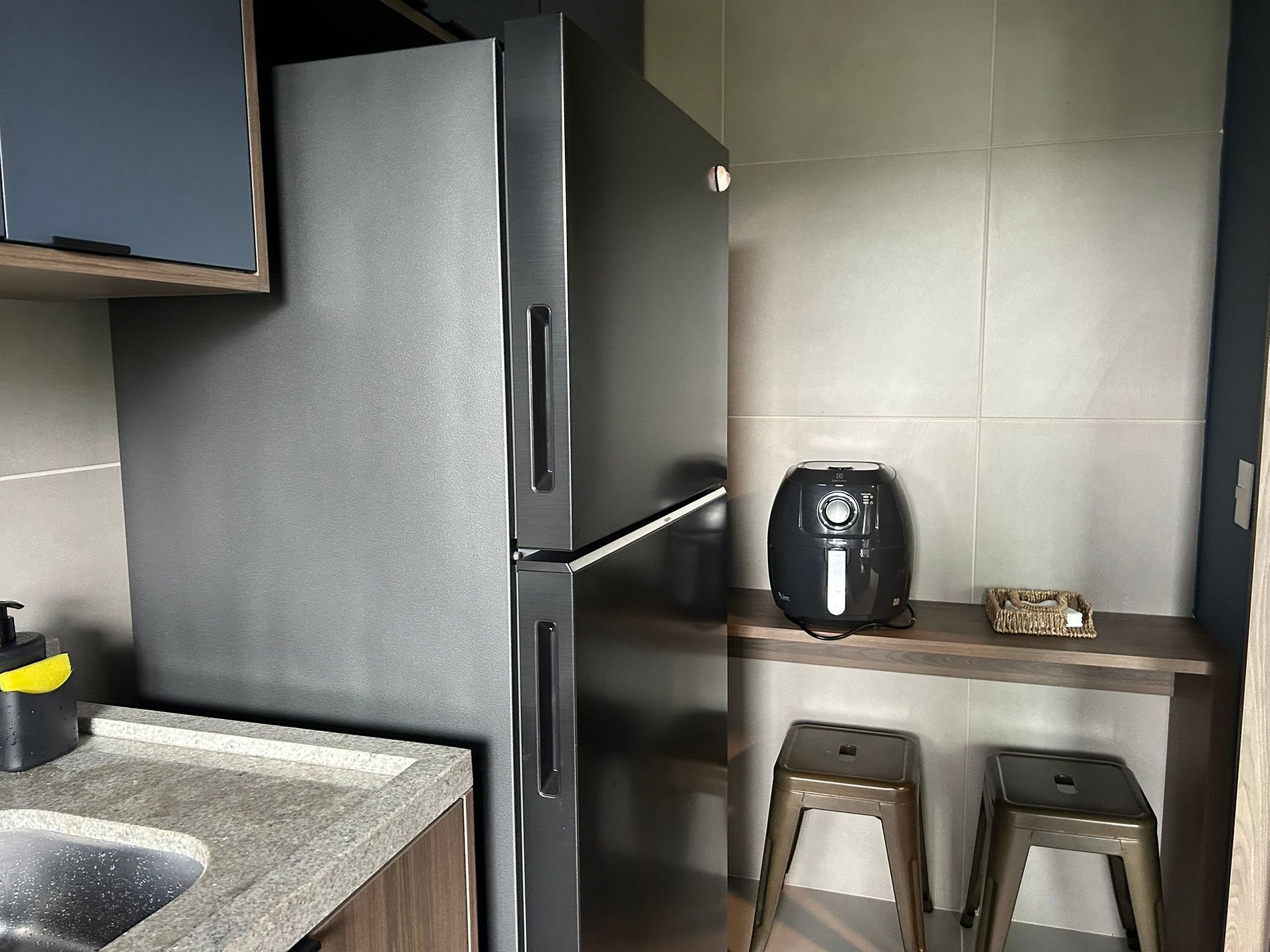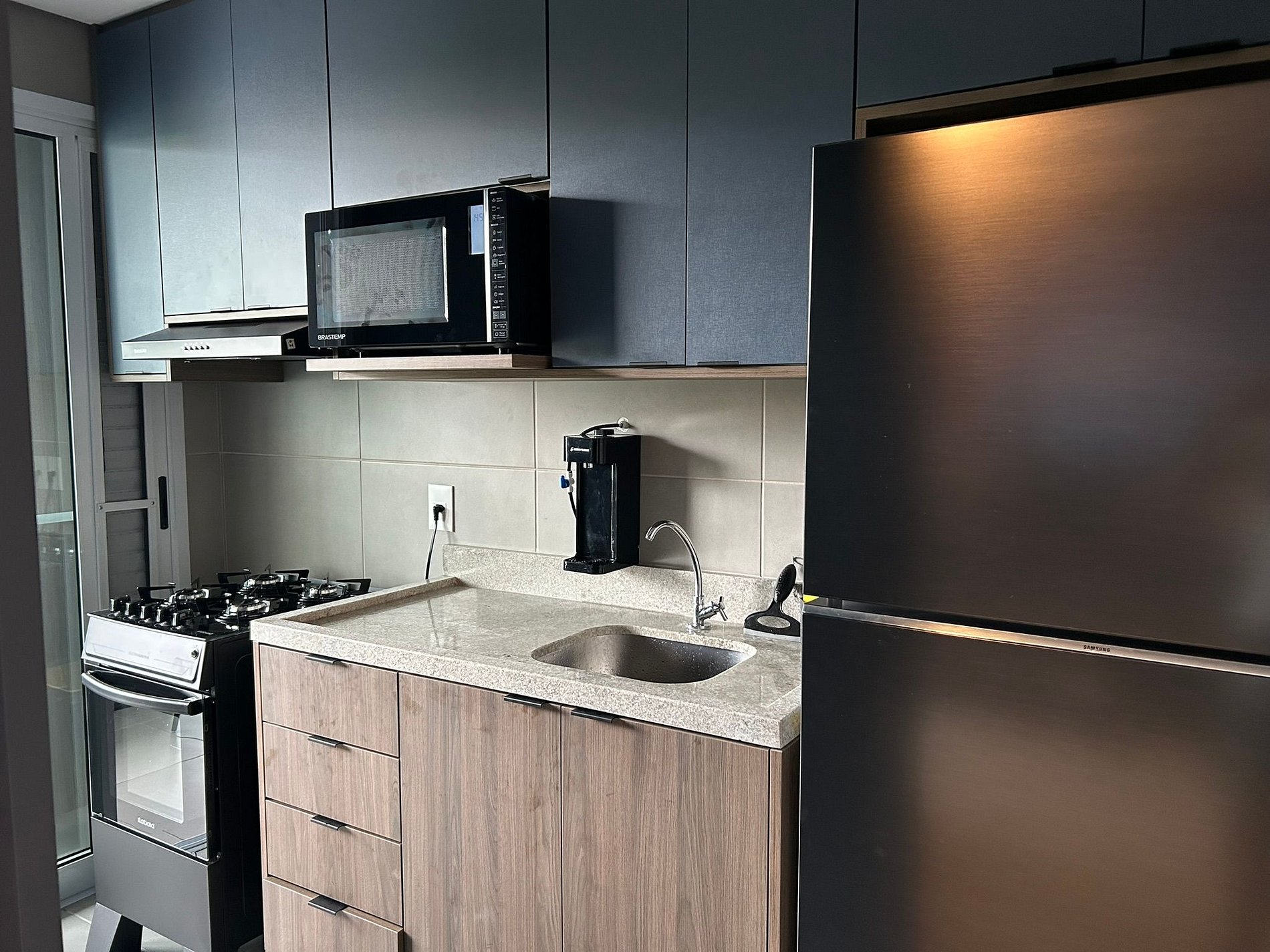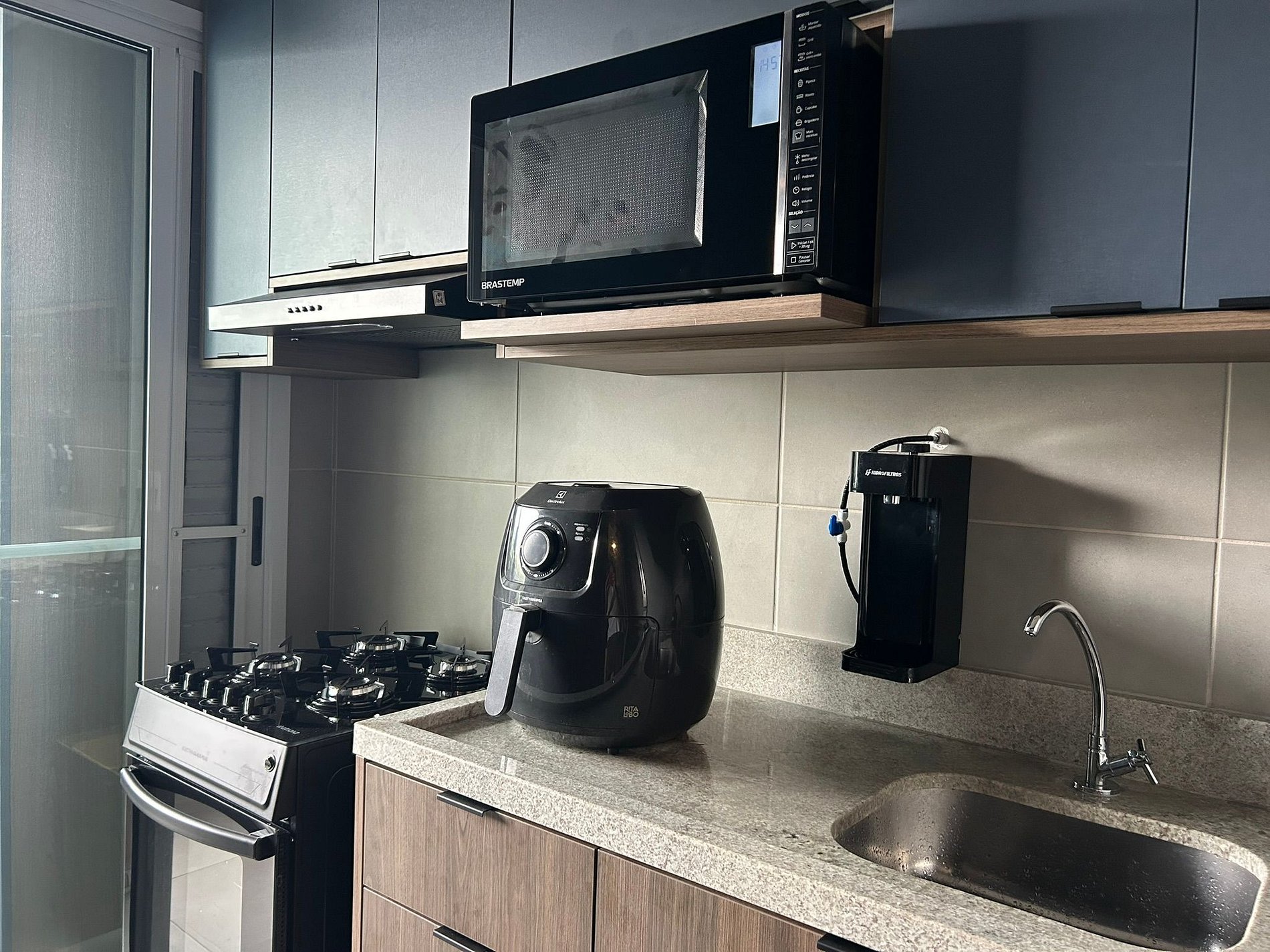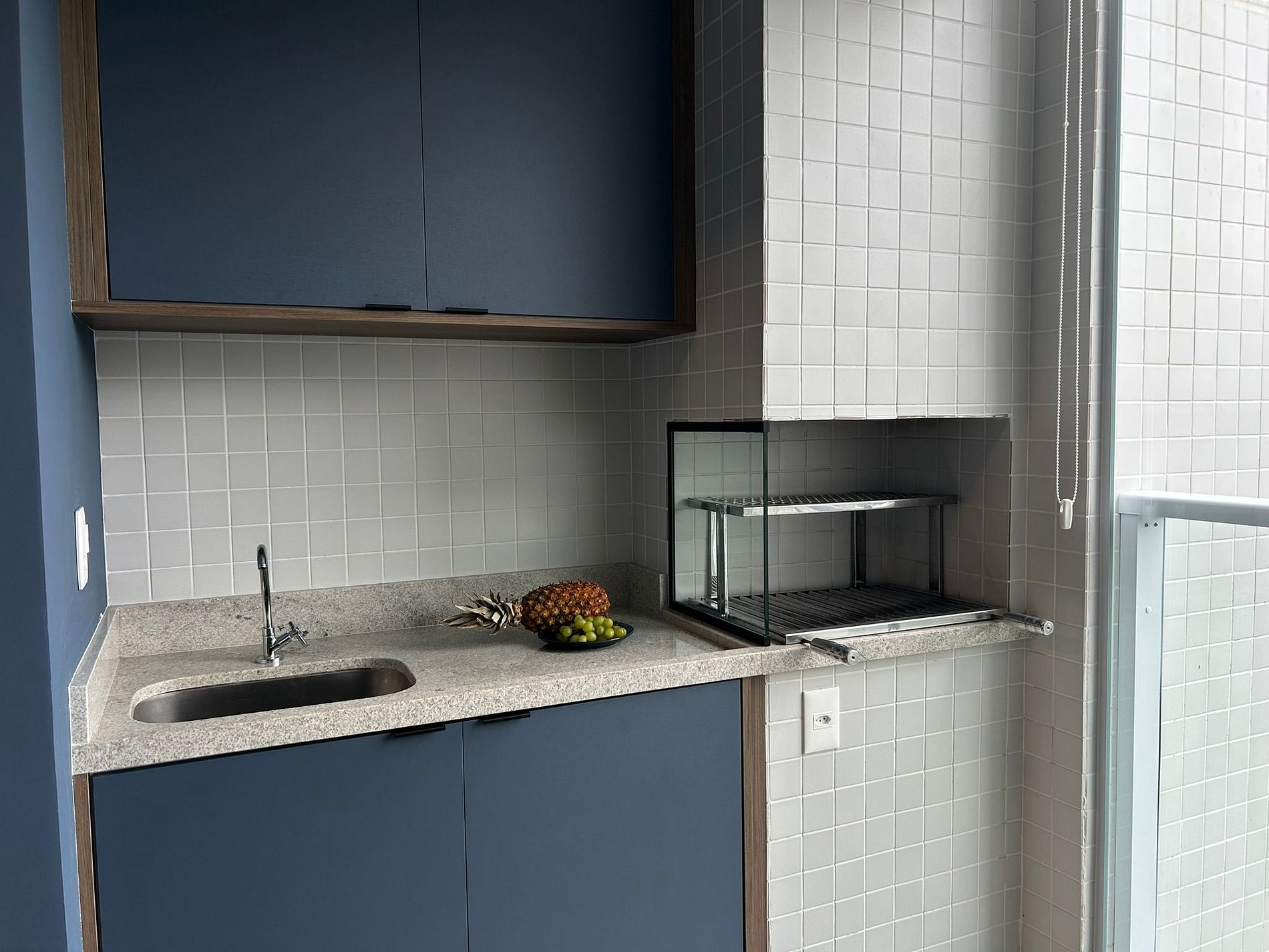 Balcony with barbecue grill, fully equipped kitchen, and air conditioning.