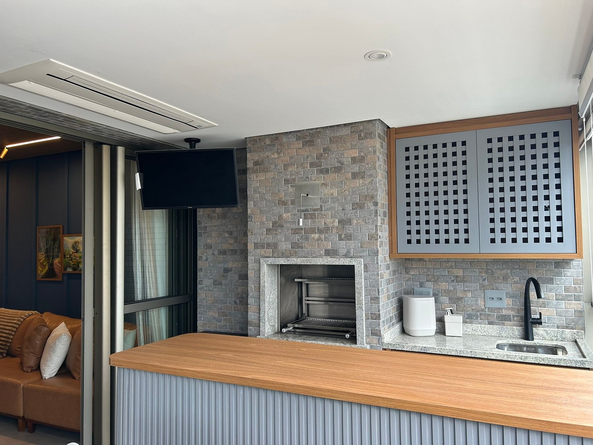 Gourmet balcony equipped with barbecue grill, sink, cabinet, table, chairs, beer fridge, and TV. View of the ocean.