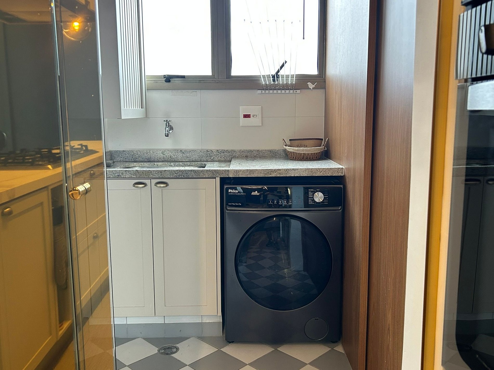 Air conditioning in the bedrooms, on the balcony, and in the living room. Kitchen with oven, microwave, stove, and dishwasher.