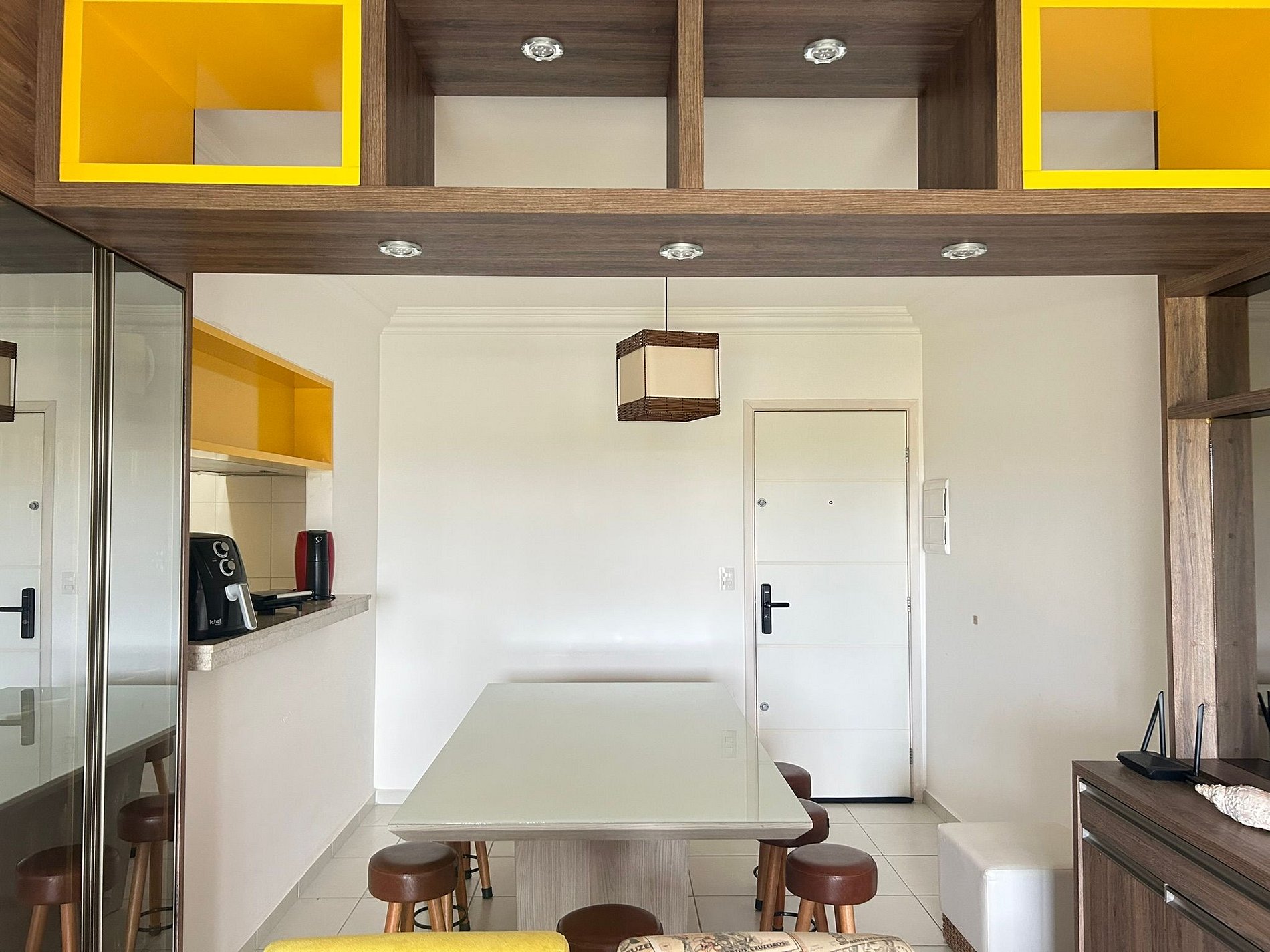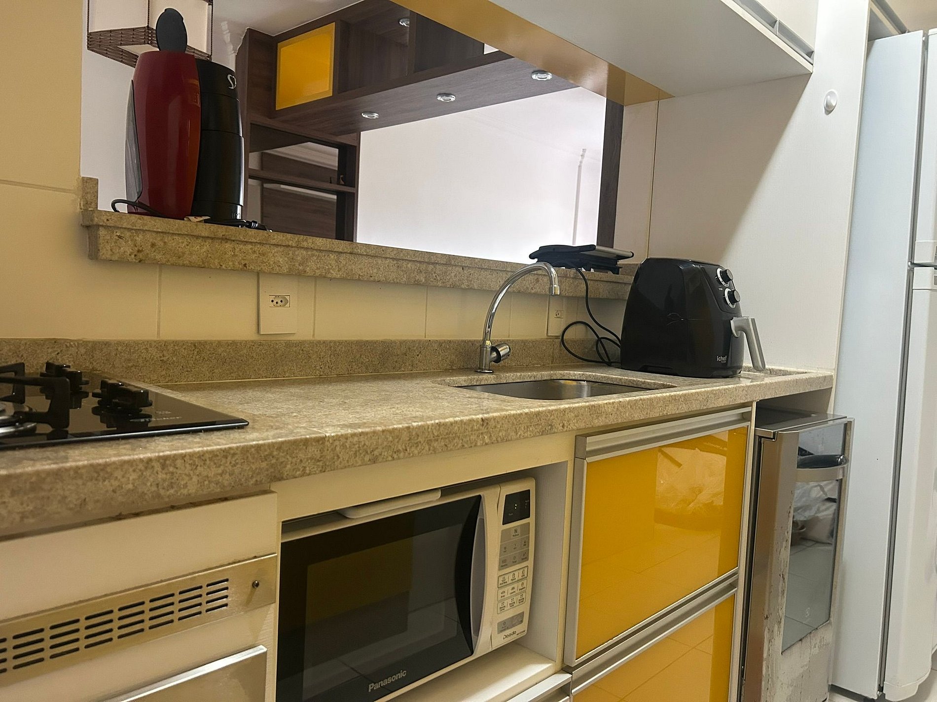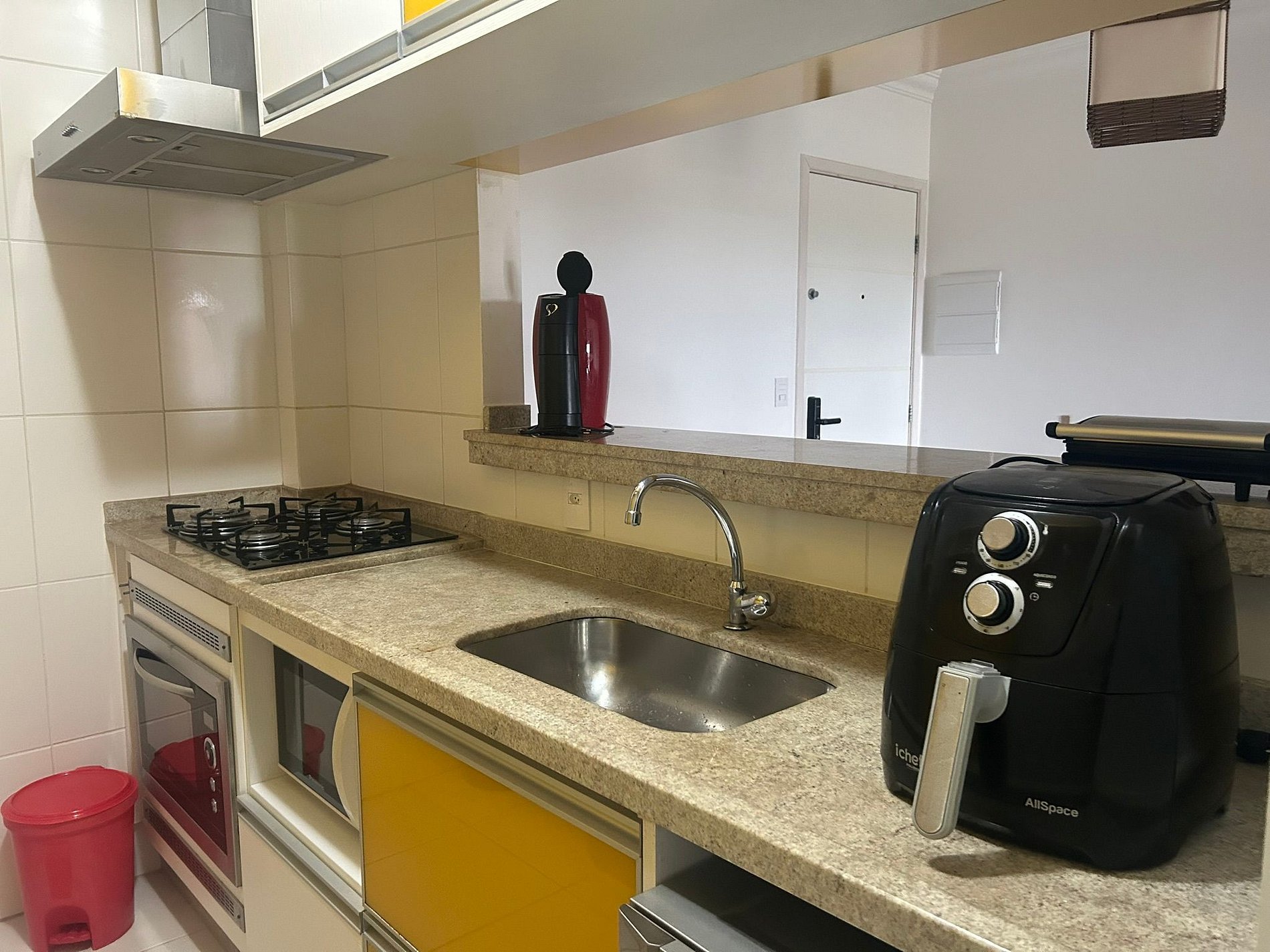 Fully equipped with stove and oven, refrigerator, microwave, dishwasher, Três Corações capsule coffee maker, blender, juicer, rice cooker, popcorn maker, dishes, glasses, cutlery, pots, baking dishes, and various utensils.