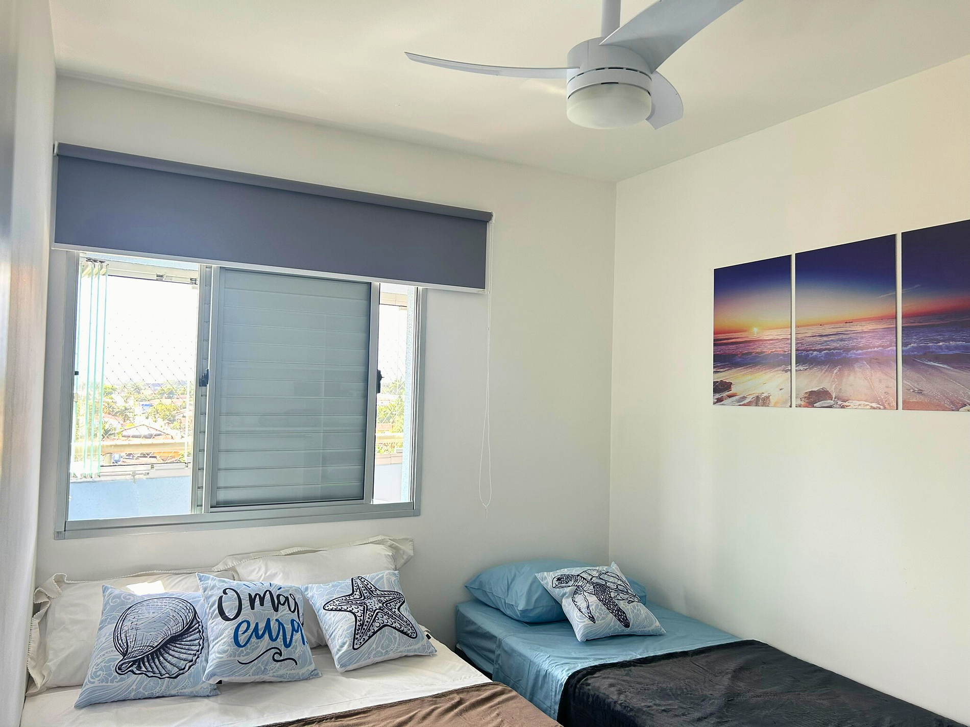 Sleeps up to 3 people. Includes one double bed and one single bed, ceiling fan, wardrobe, and blackout blinds.