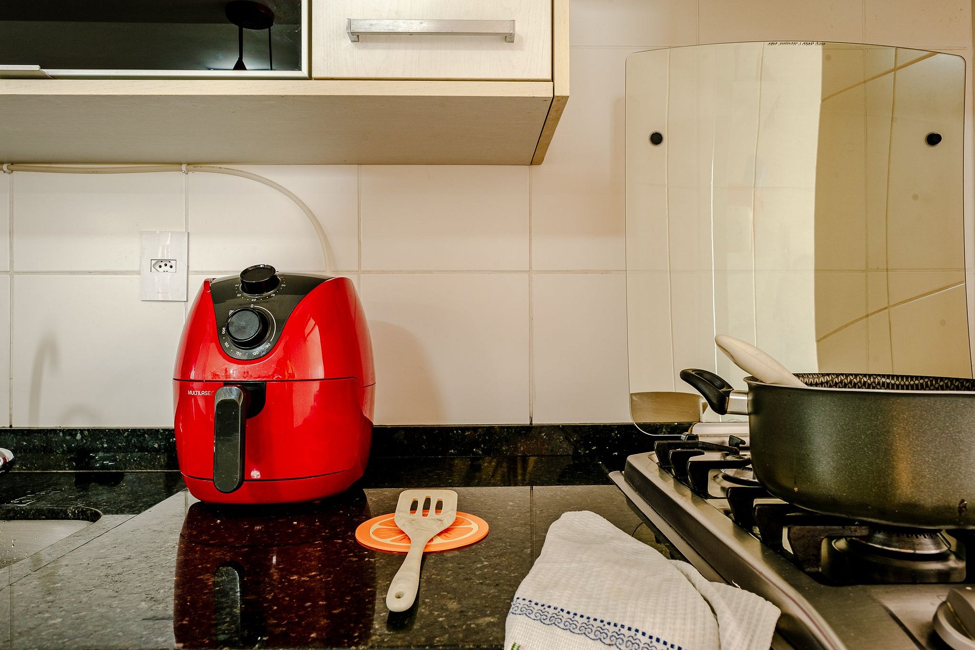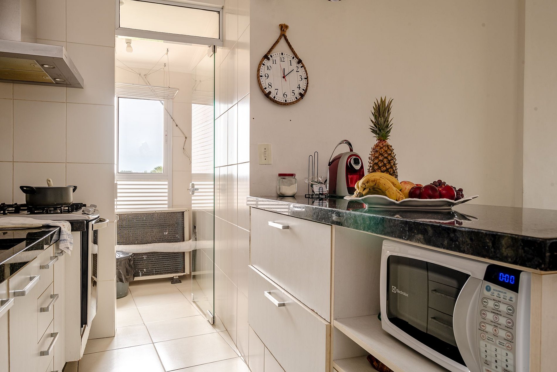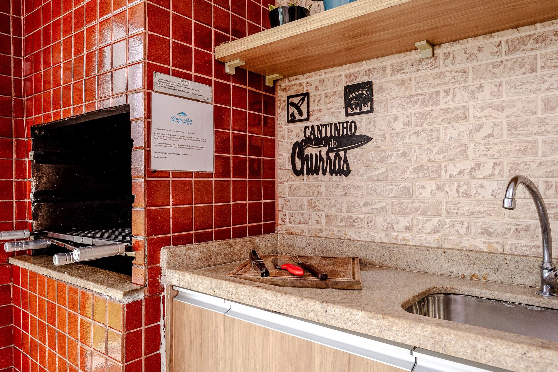 Cocina con horno, refrigerador, microondas, cafetera de cápsulas Três Corações, licuadora, batidora, exprimidor de frutas. Vajilla, cubiertos, vasos, ollas, refractarios y otros utensilios.