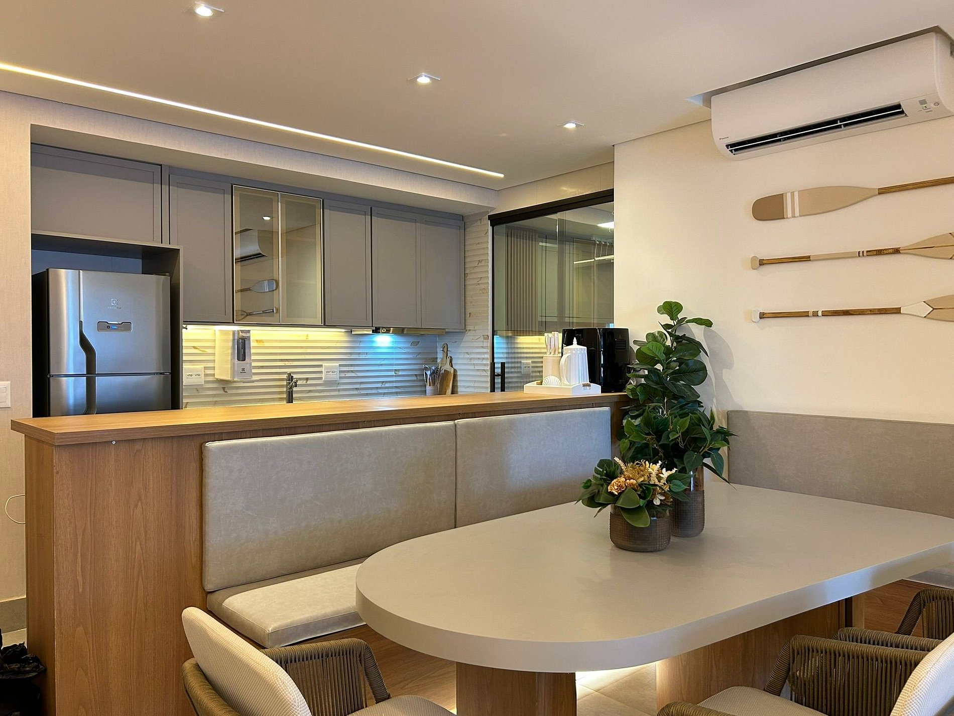 Sala con aire acondicionado, sofá y TV, integrada con la cocina.
