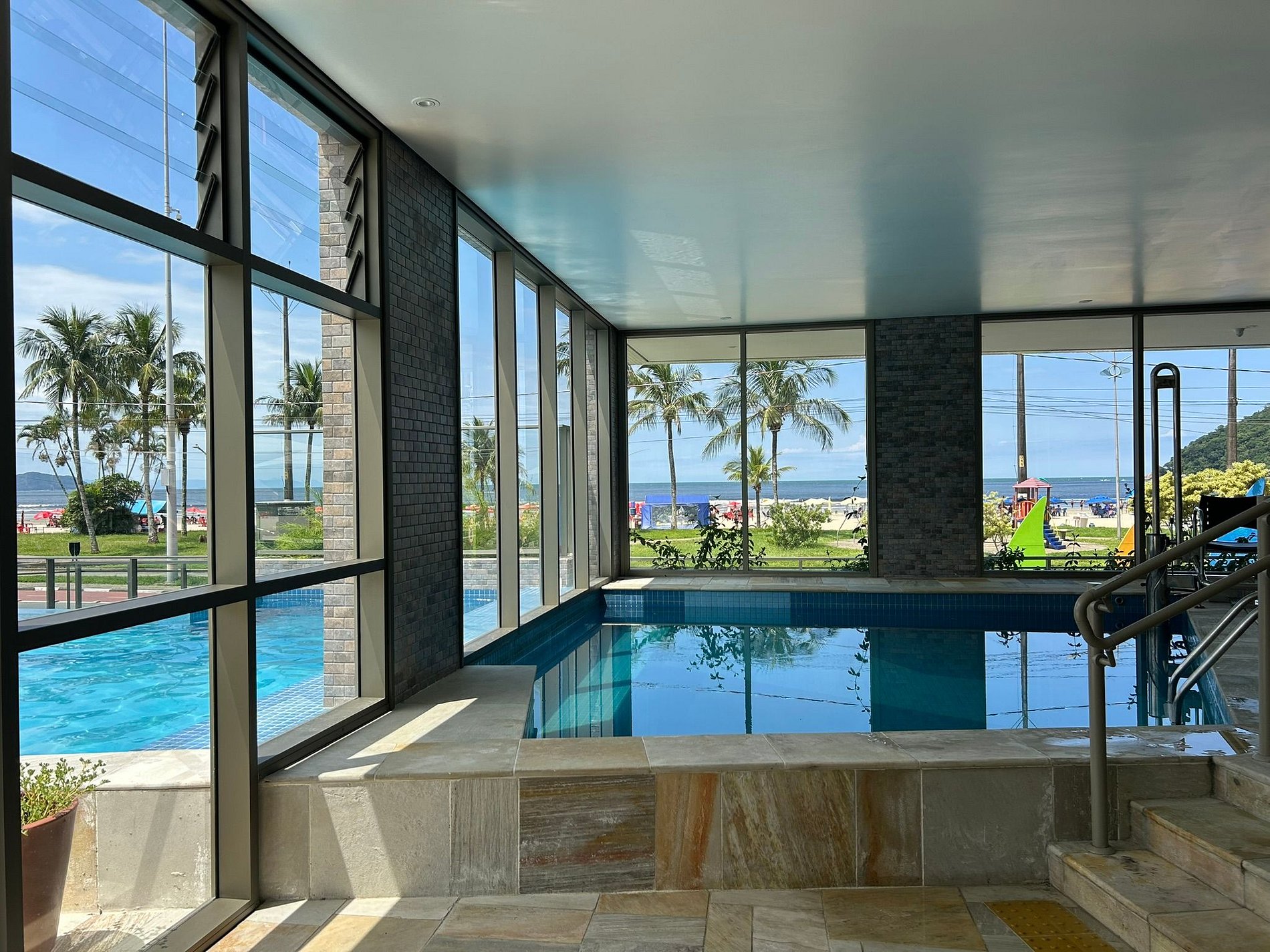 Área de ocio con piscina con vista al mar, piscina climatizada, sauna, gimnasio, sala de juegos, ludoteca y parque infantil.