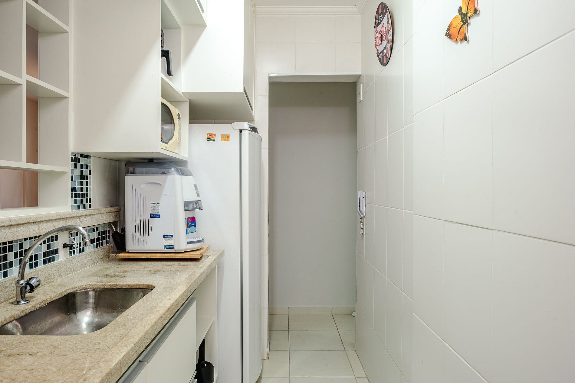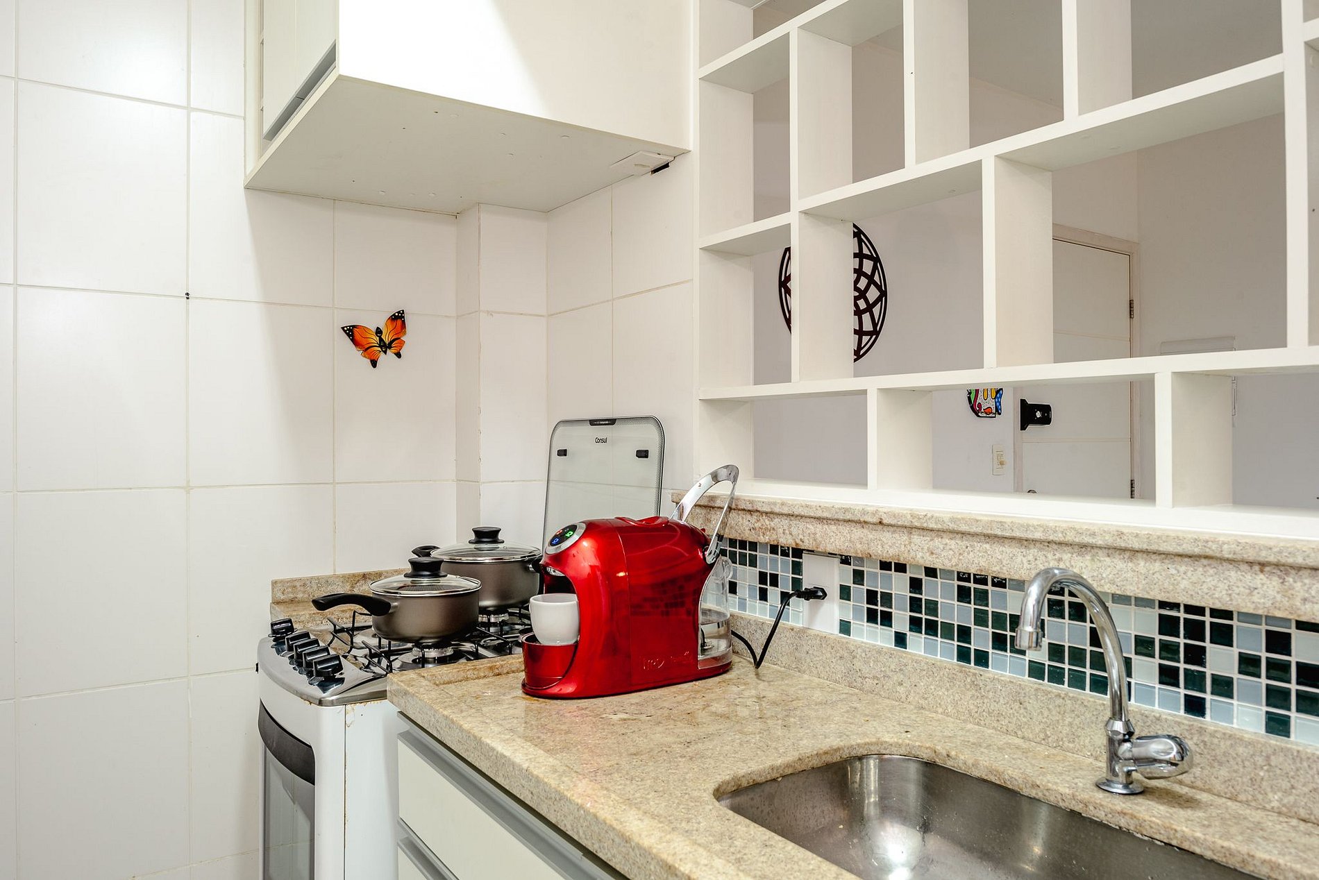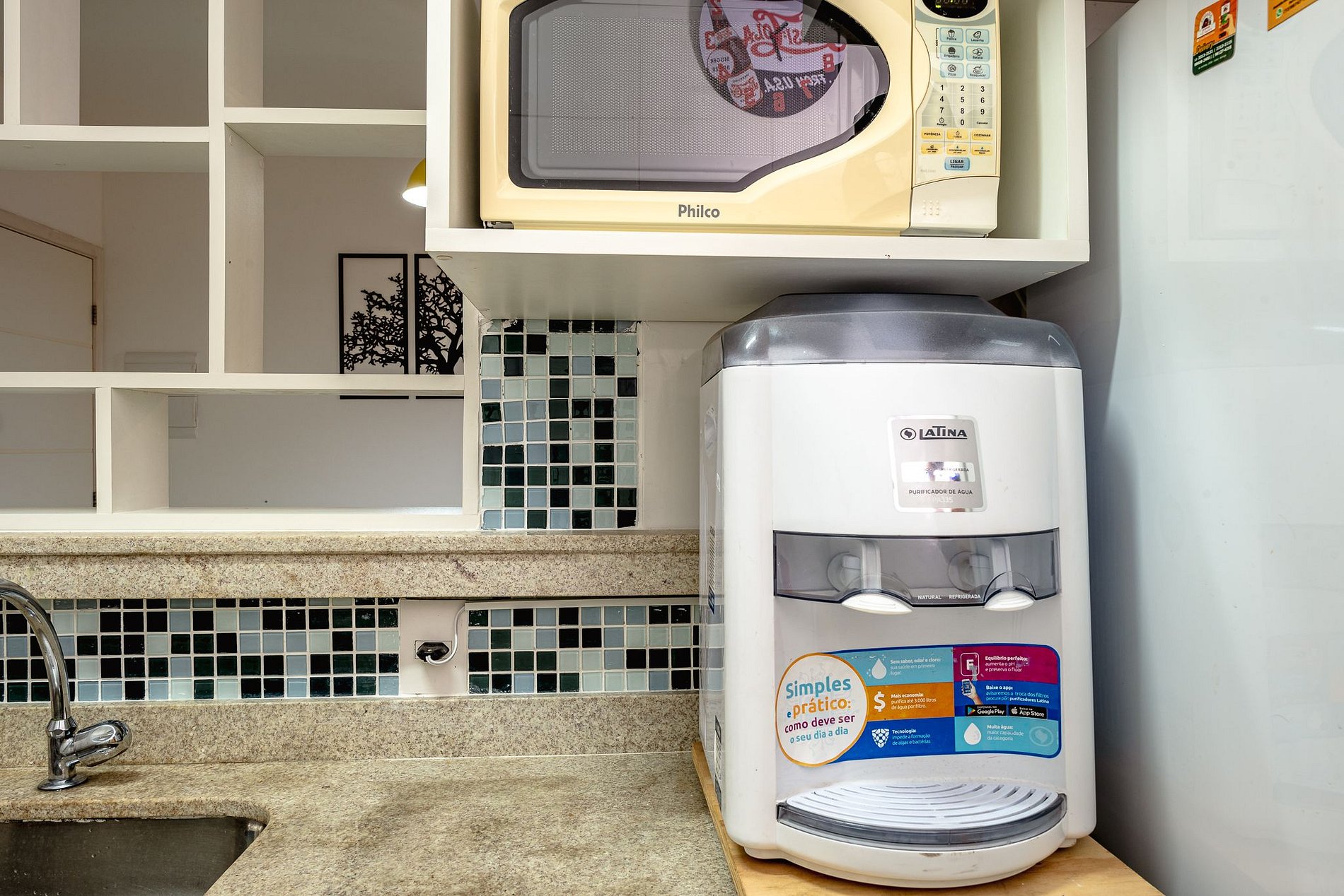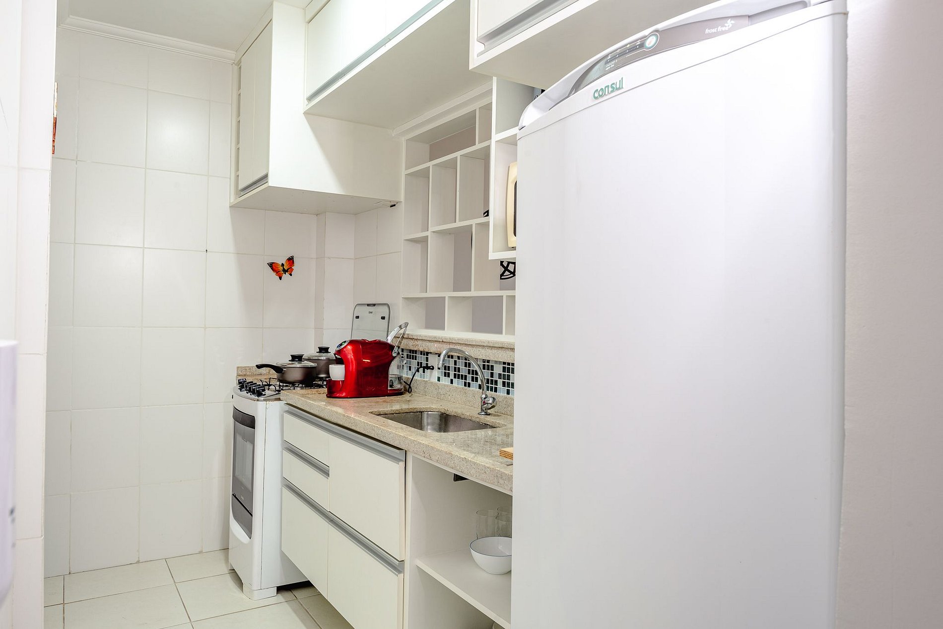 Cocina con horno, nevera, microondas, cafetera de cápsulas Três Corações, licuadora, exprimidor, vajilla, vasos, cubiertos, ollas, refractarios y utensilios diversos.