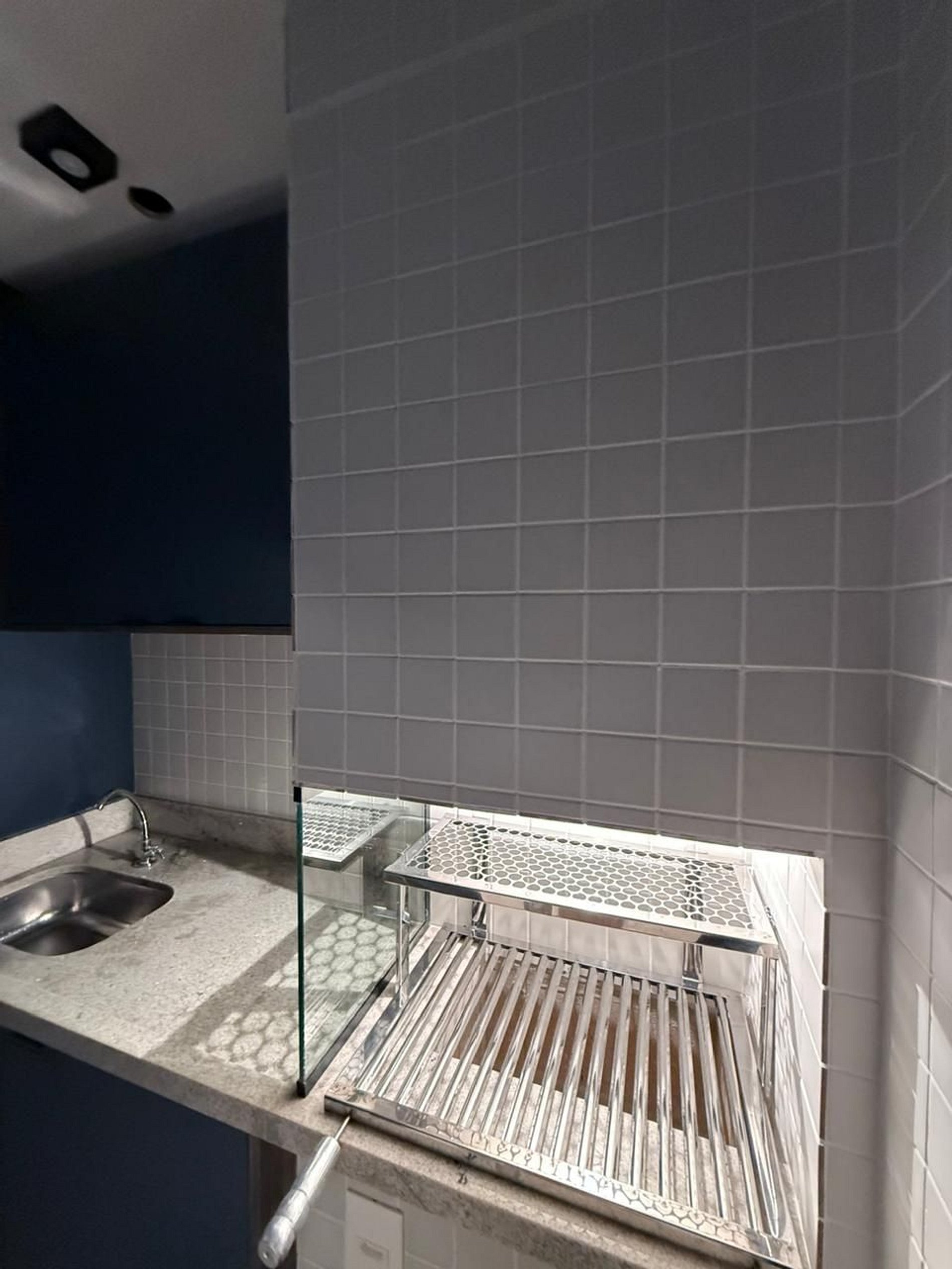 Varanda com churrasqueira, cozinha completa e ar condicionado.