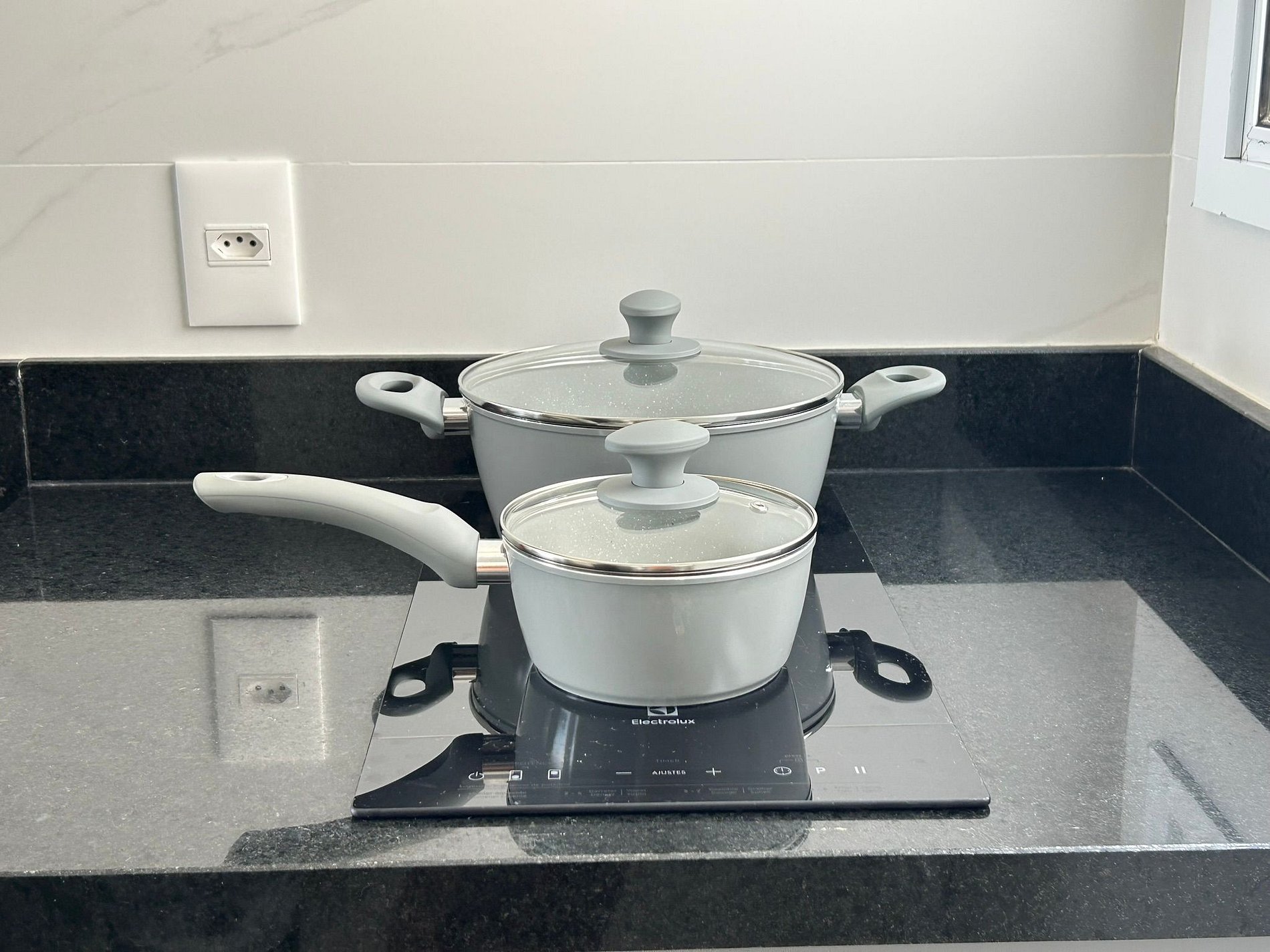 Totalmente equipada com fogão e forno, geladeira, micro-ondas, liquidificador, sanduicheira, panelas, refratários e utensílios diversos.
