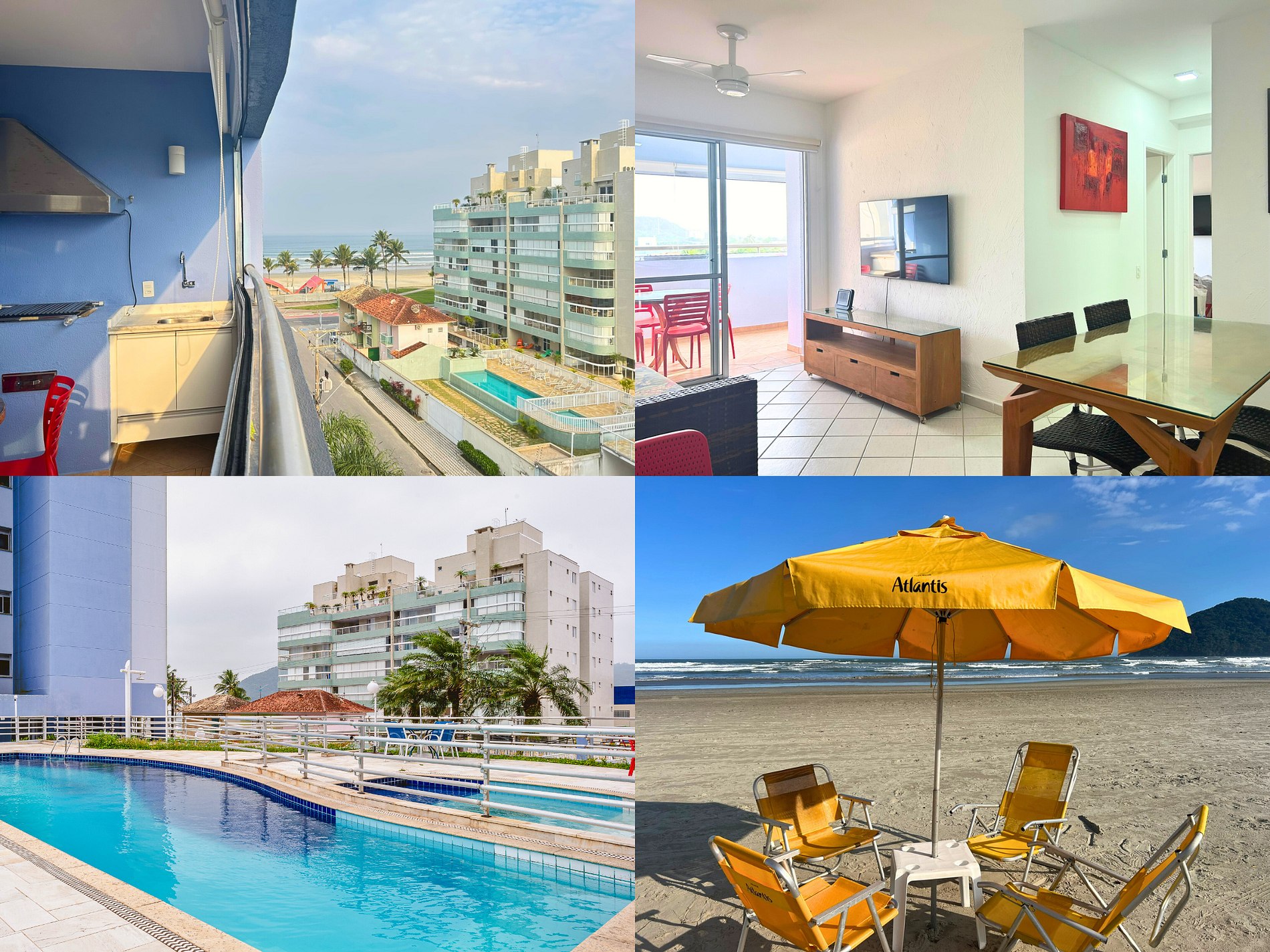 Disponível diariamente das 09h às 18h, com 1 guarda-sol e 4 cadeiras por apartamento. Normalmente o serviço é montado em frente ao prédio. Em situações pontuais, pode ser necessário solicitar diretamente na portaria.