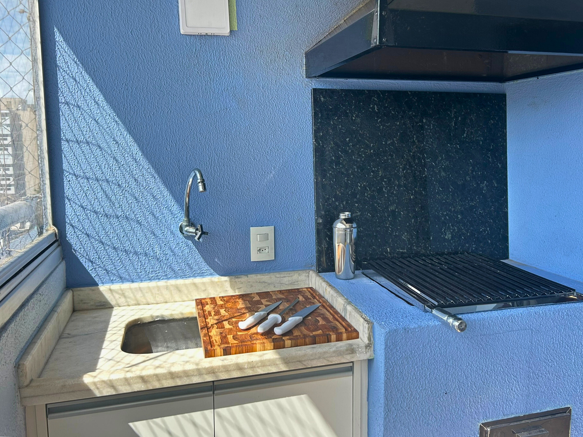 Varanda espaçosa equipada com churrasqueira, pia, armário, mesa e cadeiras.