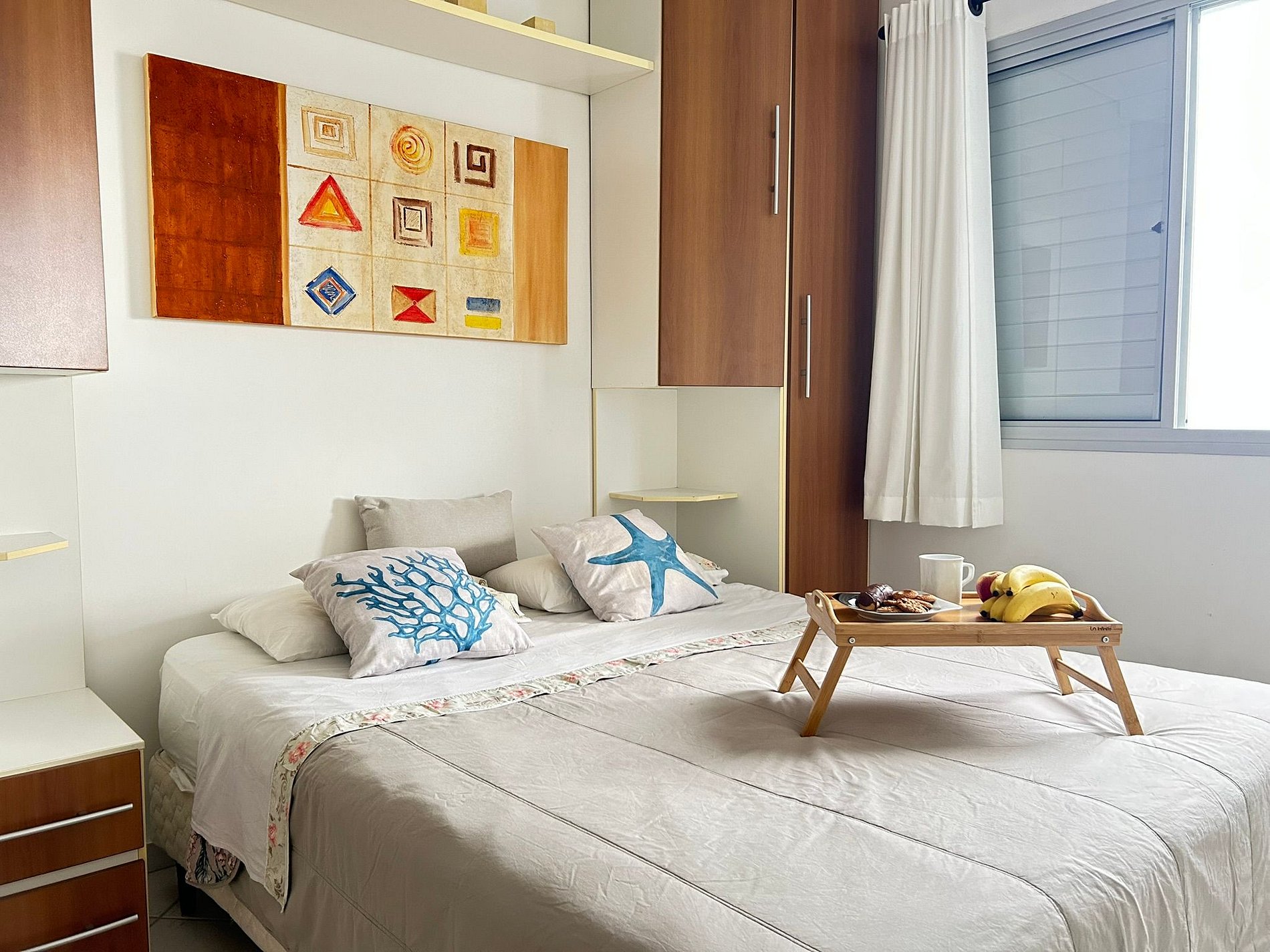 A suíte acomoda até 3 pessoas. Conta com uma cama queen e um colchão de solteiro. Do quarto, você desfruta de uma linda vista da praia de Bertioga.