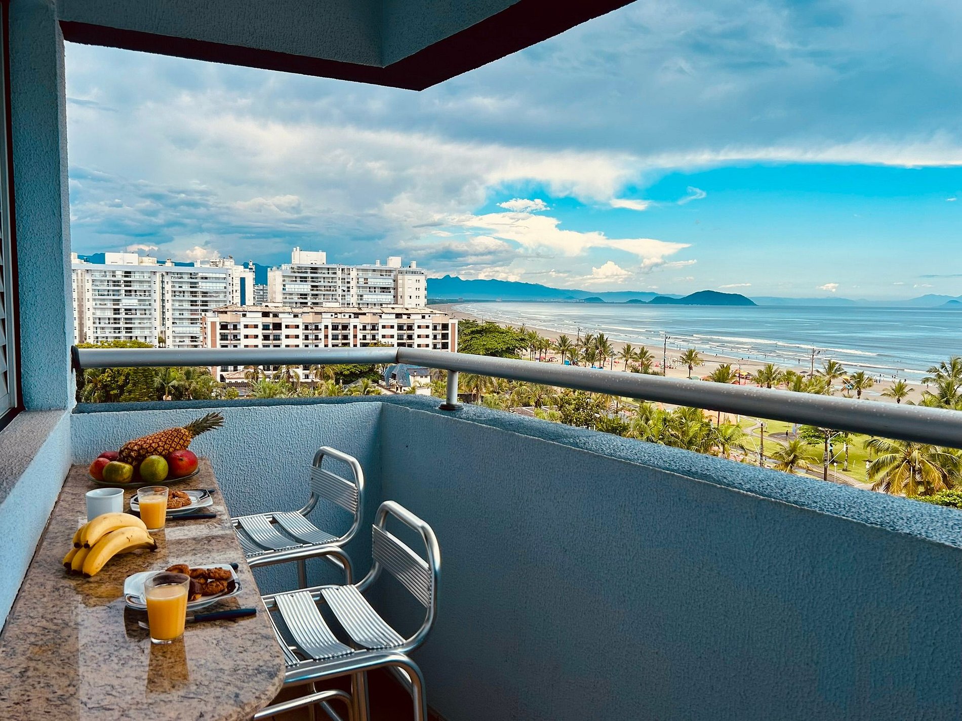 A varanda é equipada com churrasqueira, pia, bancada e cadeiras. A vista para o mar é simplesmente maravilhosa.